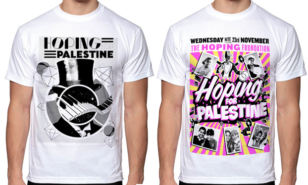Large-scale background graphic and t-shirt, commissioned by Bella Freud for Hoping for Palestine charity events.
